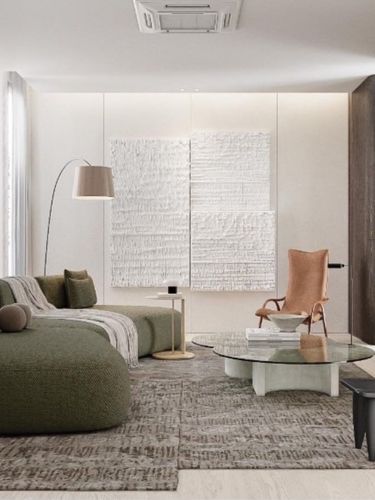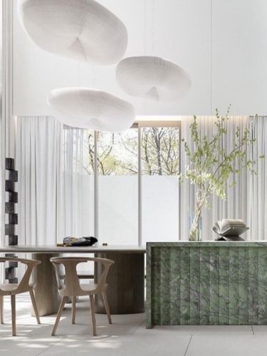 The dining room, an essential space, designed with a crafted, serene material palette to create a peaceful atmosphere, where life, people, and art come together in perfect harmony.